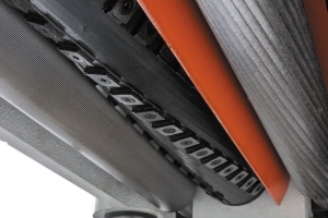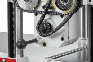 Мотор расположен внизу в тумбе и не занимает верхнюю часть корпуса, это позволило установить два металлических ролика для обратной подачи заготовок и обеспечить удобный доступ к строгальному валу для замены и регулировки ножей. В штатной комплектации установлен барабан с тремя прямыми лезвиями. Для интенсивной эксплуатации, при частой работе с твердыми и свилеватыми породами, при повышенных требованиях к качеству обработки рекомендуется приобрести и установить вал helical, имеющий 75 четырехсторонних твердосплавных сегмента с радиусной режущей кромкой.